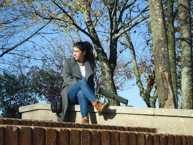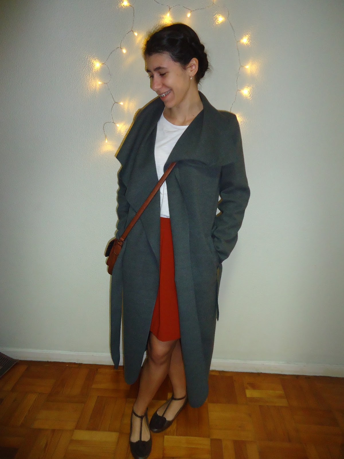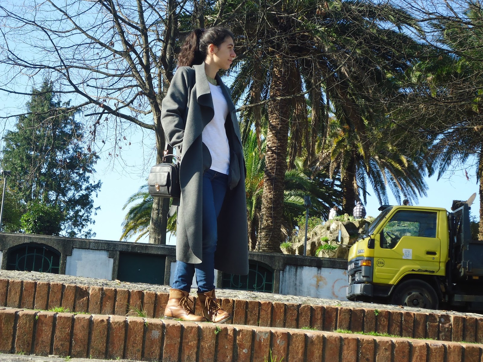 Queria um look simples de montar, mas nada demasiado básico. Então o que é que fiz: escolhi um vestido básico e conjuguei com um casaco bem diferente e fora do vulgar.